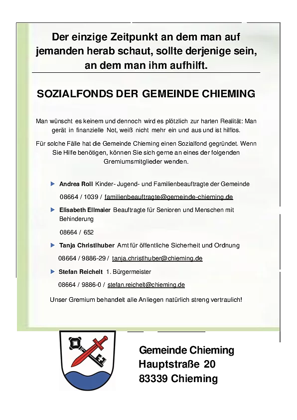 Der Sozialfonds der Gemeinde Chieming finanziert sich ausschließlich aus Spenden, Schenkungen und ähnlichen Zuwendungen für kommunale/gemeinnützige Zwecke.