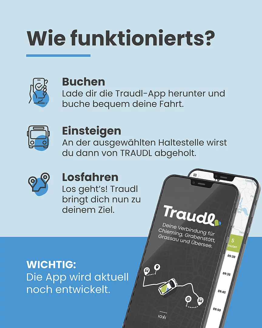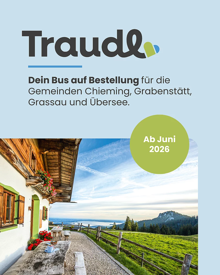 Traudl ist ein Rufbus, der Sie ab 1. Juni 2026 auf Abruf flexibel und individuell in den Orten Chieming, Grabenstätt, Übersee und Grassau von A nach B bringt.