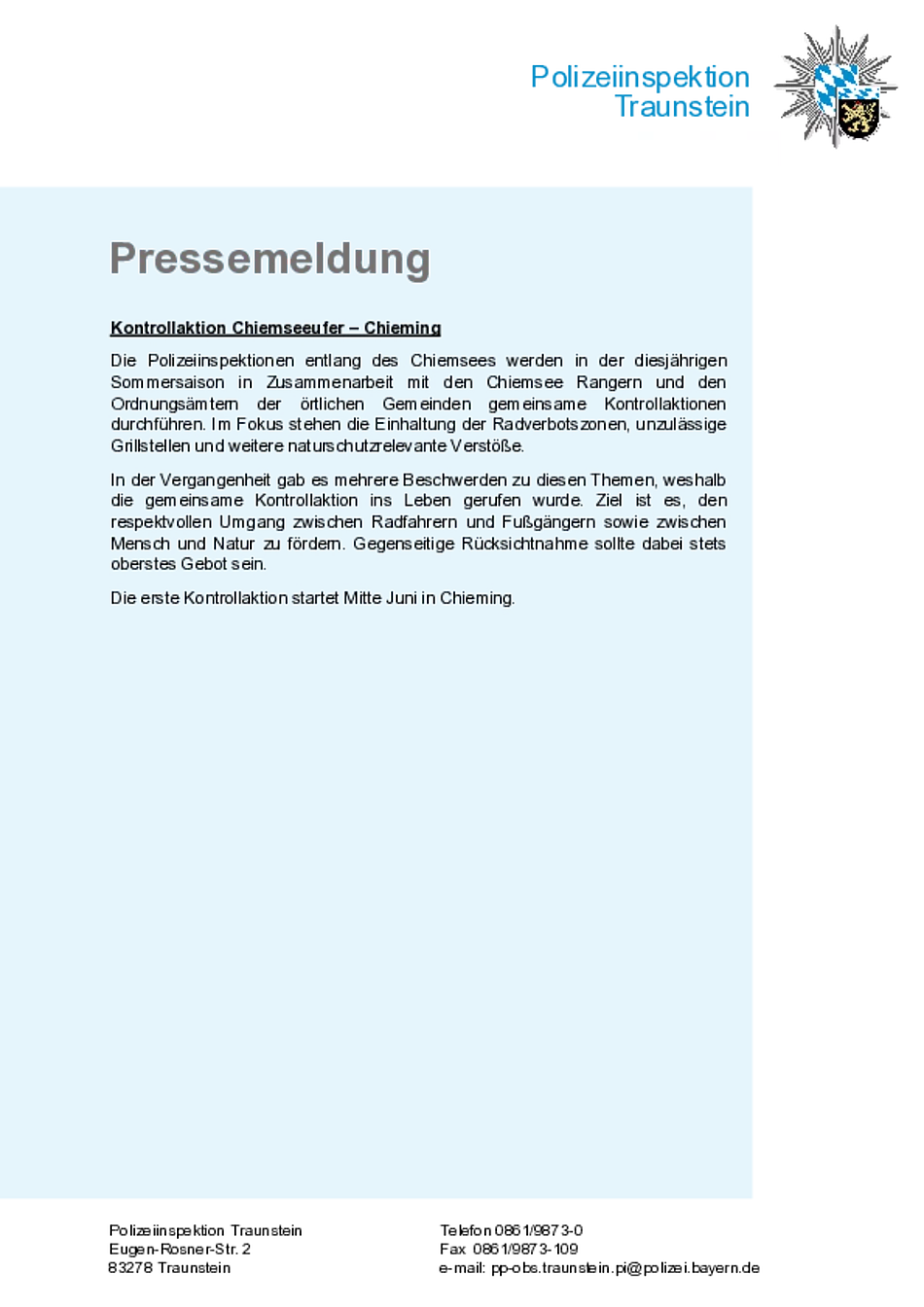 Pressemitteilung zur Kontrollaktion Chiemseeufer Chieming